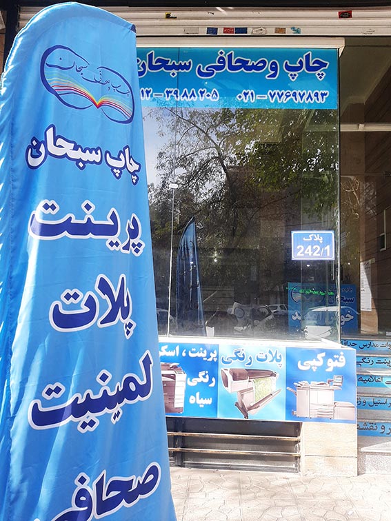 آدرس : تهران ، محله اوقاف ، ابتدای تکاوران شمالی مابین کوچه 14 مرکزی و کوچه نوروزی پلاک 242/1 ، چاپ و صحافی سبحان